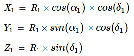 x1 = R1 * cos(α1) * cos(δ1) = -1.612114796496