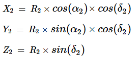 x2 = R2 * cos(α2) * cos(δ2) = +3.132415450567