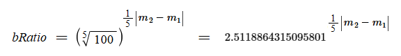 BRIGHTNESS RATIO BETWEEN TWO STELLAR MAGNITUDES Given: m1 = +0.000 m2 = +0.000 Then: m1 and m2 are equal in brightness.
